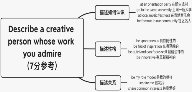 通过对题卡进行审题,确定题目考查描述对象是任务,限定成分是创造力, 崇拜的, 所需时态为一般现在时,现在完成时,一般过去式等。关于人物题我们可以从三个部分展开描述,即(1)背景介绍 (2)扣题描述 (3)原因/感受。首先关于(1)背景介绍, 可以从该人物的职业和成就两个角度进行展开。其次(2)扣题描述,可以描述创造力,通过举例子解释创造力,铺垫细节。最后从(3)感受两个方面来去描崇拜的原因,强调可以促进年轻人进步和做慈善等影响。其中关于原因的描述我们也可以利用 Cheers 原则进行展开,比如社交 Communication, 健康Health, 金 钱 Economy/money, 教 育 Education, 娱 乐Recreation/entertainment, 放松 Stress/relaxation。