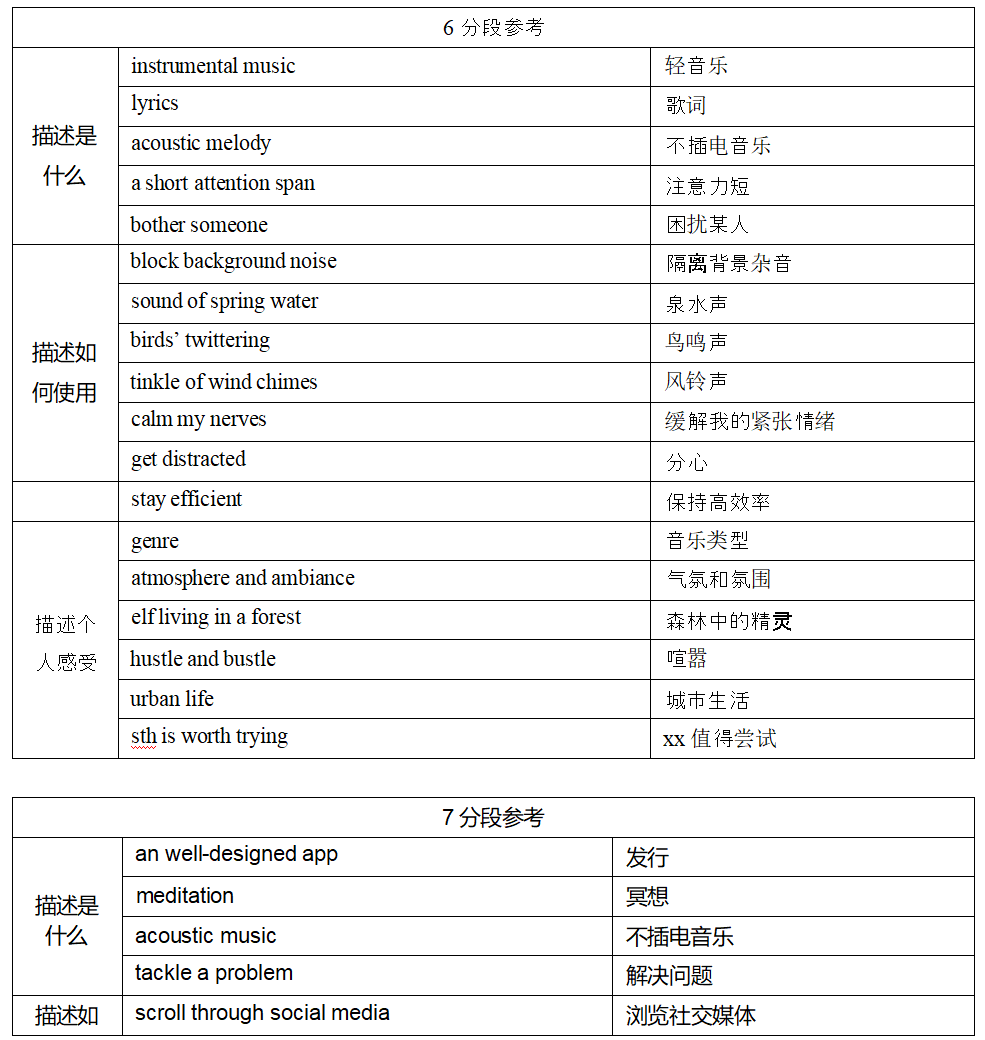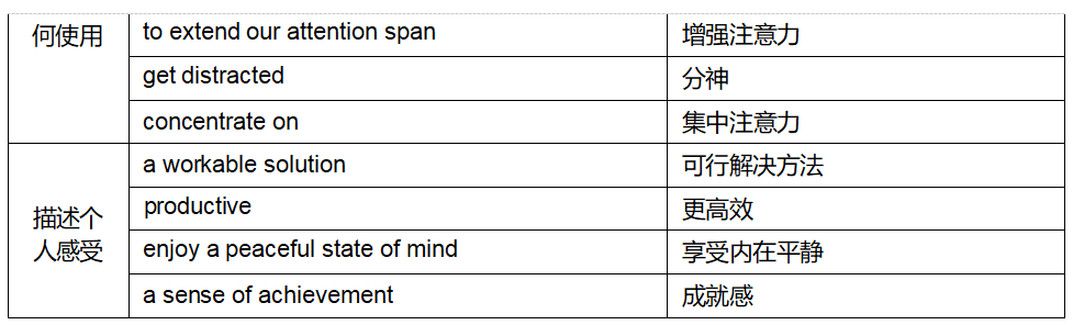 本题可以选择的题材还是比较多的,一般有助于我们集中注意力的可以是一些习惯的养成,比如手机 app ,去图书馆学习,冥想,瑜伽,甚至在工作时放一些舒缓的音乐,都有助于将我们和身边的一些 distraction (分散注意力)的事物隔开。在描述你如何使用这些方法的时候,可以通过时间的顺序少做描 述,比如开始的时候,还是有些困难,但是后来越来越能集中注意力。然后再谈一下,集中注意力后的感 受和好处,比如工作效率的提升,更有成就感,会将其推荐给朋友等等。