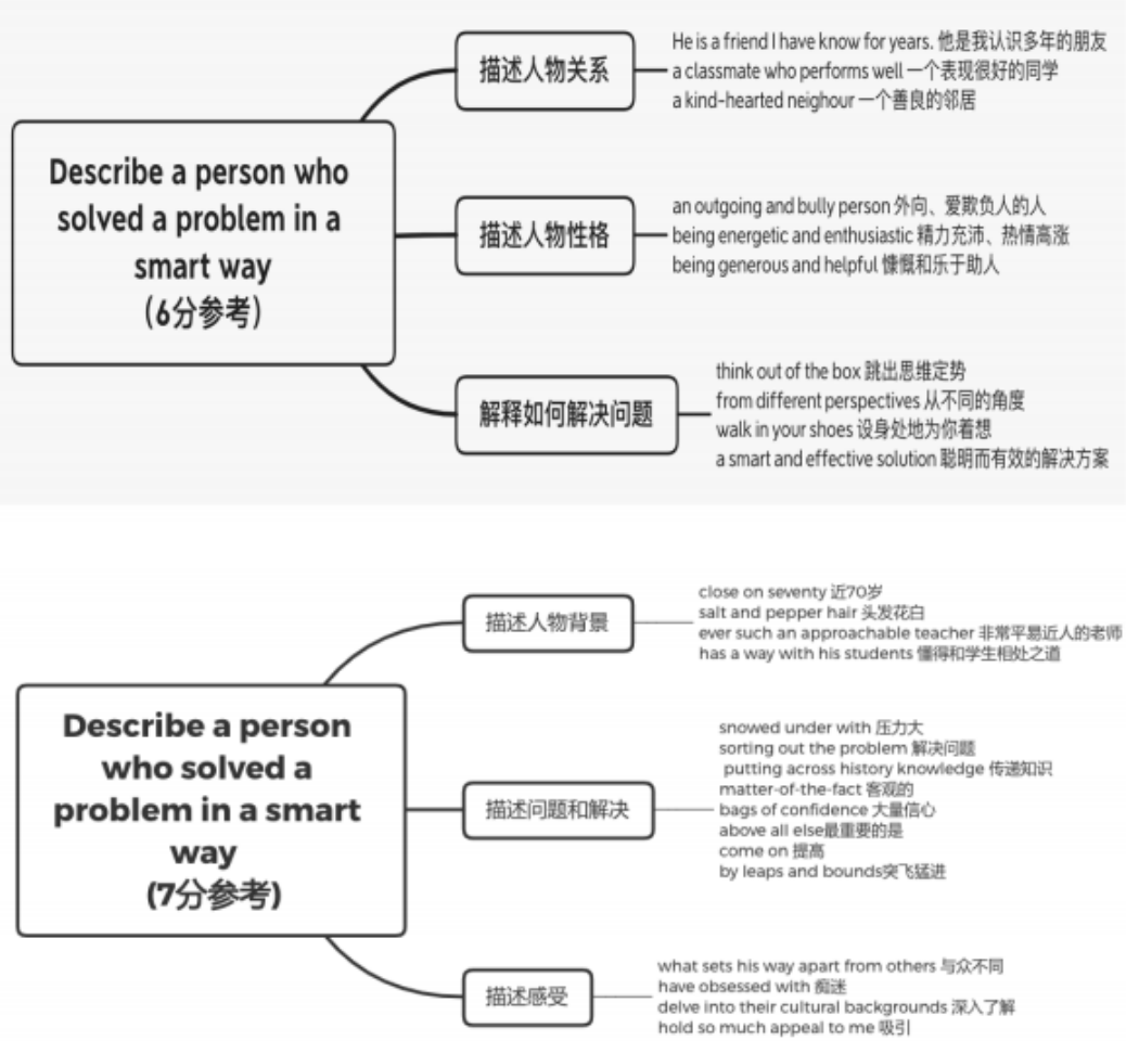 通过对题卡进行审题,确定题目考查描述对象是人物,限定成分是使用聪明的方式解决问题, 所需时态为 一般现在时,现在完成时,一般过去式,过去完成时,过去进行时等。关于人物题我们可以从三个部分展开 描述,即(1)背景介绍 (2)扣题描述 (3)原因/感受。首先关于(1)背景介绍, 可以从该人物性格和职业两个角 度进行展开。其次(2)扣题描述,可以从问题内容和解决方式展开,首先对问题进行描述,阐述问题起因。 其次提供解决方案,描述解决方案内容,其次强调解决方案聪明特征,最后问题被解决之后结果。最后从 (3)原因/感受两个方面来去描述聪明解决方式的原因。其中关于原因的描述我们也可以利用 Cheers 原则 进行展开,比如社交 Communication, 健康 Health, 金钱 Economy/money, 教育 Education, 娱乐 Recreation/entertainment, 放松 Stress/relaxation。