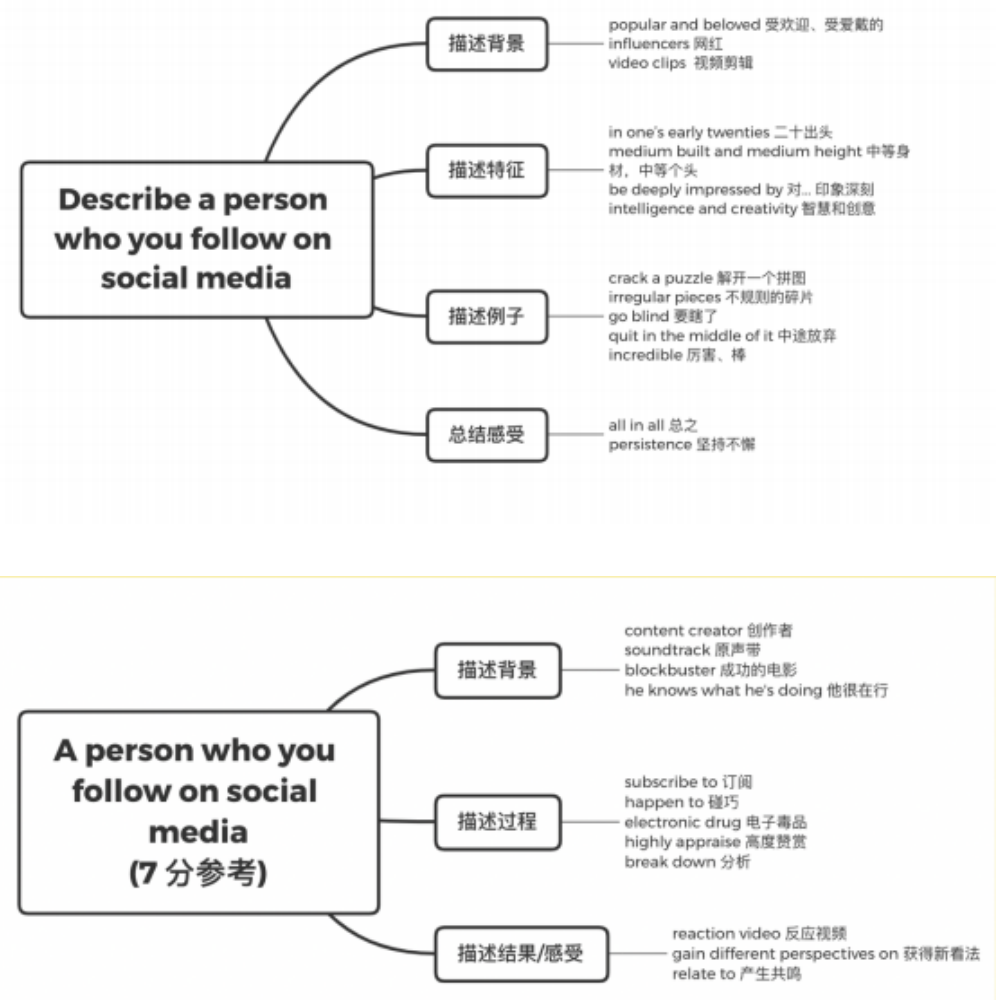 本题在本质上依然属于一个“名人”类的话题, 在解题时, 需主动提到此人的过人之处,例如美妆、体育、烹 饪等等方面,且需要关注 social media 的关键信息和特殊属性, 使用例如收藏、点赞、订阅等相关的语言 表达。