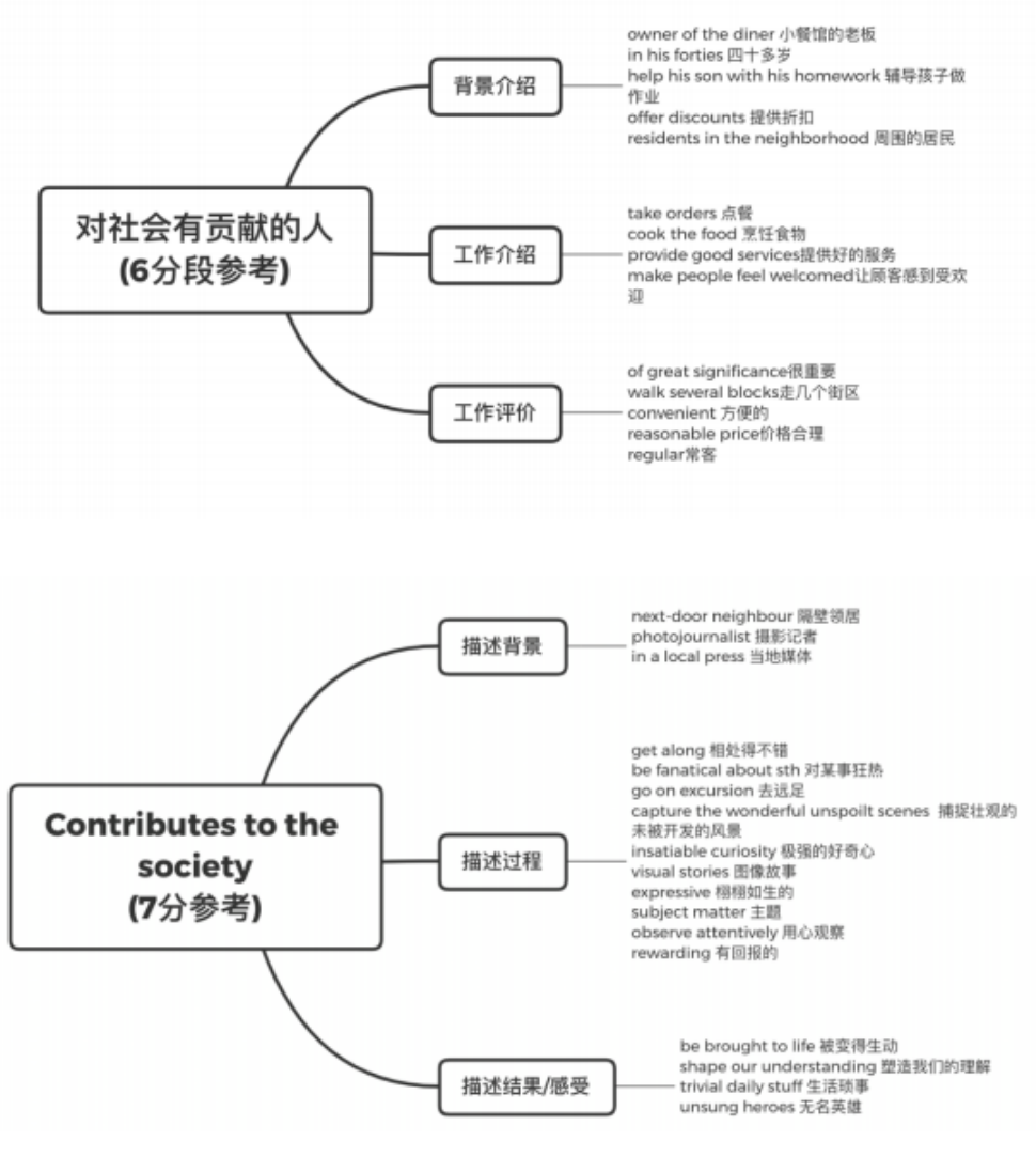题目要求描述一个对社会有贡献的人。题目中提示我们可以介绍 ta 是谁,你怎么知道这个人的, ta 是做 什么类型工作的,你为什么觉得 ta 做的事情对社会有贡献。我们可以补充说明,这个人的年龄,国籍, 你第一次听说这个人的时候,对 ta 的看法是什么,你有没有从 ta 的工作中获益,你对 ta 的工作有何看法。 这道题的思路比较好想,其实任何一个工种,都给社会上的其他人提供了相应的服务和贡献 ,如清洁工凌 晨打扫街道,给上学上班的市民提供整洁的通勤环境;早餐店的老板每天早起做美味大碗的早餐给大家吃; 大学教授发表论文,分享研究成果,上课培养学生等等。
