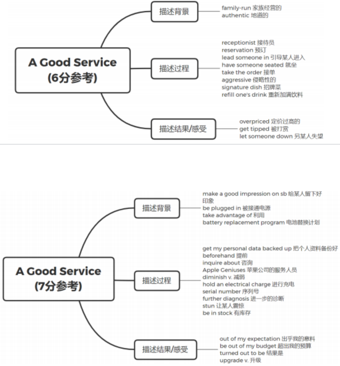 本题是一道事件经历类话题:描述一个你曾经接受过的好的服务。在选材上,我们可以选取日常生活场景 中常见的一些体验,比如在购物(包括线上购物)、就餐、旅行、兴趣课程、医疗健康等方面受到过的好 的服务。本题的主要描述时态为一般过去时。词汇方面要使用和服务相关,以及所选取的场景相关的一系 列话题相关词汇及搭配。还要注意使用一系列可以用来形容服务优质的形容词去匹配题目中 describe a service 的限定。在句型方面,建议使用带有形容词最高级、比较级的一系列句型来突出这个服务的优质 程度。