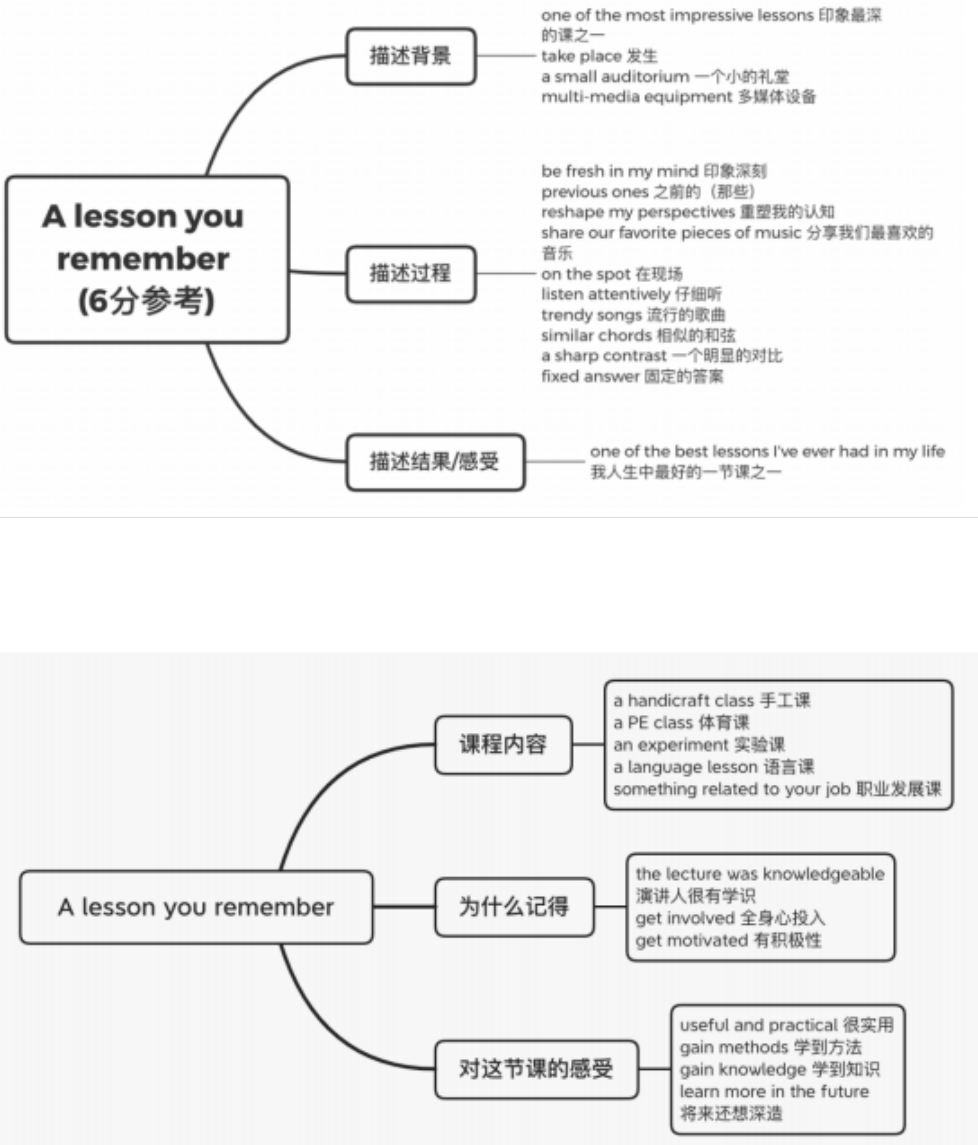本题需要描述一节难忘的课。一节课之所以难忘,可能是因为课程内容本身新颖,也可能是因为上课的老 师富有个性并且给你带来了新的思考,还可以是课堂氛围轻松融洽,和以前上过的课形成了鲜明的对比。 所以我们可以围绕课程内容、授课老师和课堂氛围这三个方面进行扩展。语言上要注意在描述上课场景的 时候要使用一般过去时,因为这些发生在过去。而在描述自己为何记得以及自己的感受时,可以加入一般 现在时,说说自己现在的感受。此外在本题的描述中,还可以使用比较级、最高级、虚拟语气等比较复杂 的句子和结构。