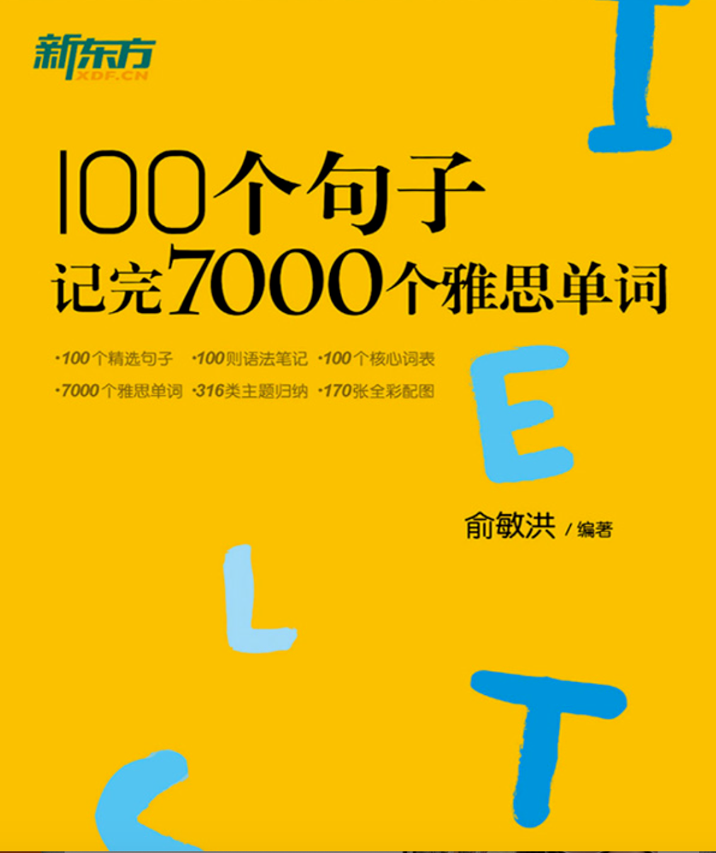 这是一本由俞敏洪老师编著的雅思词汇书。如书名所说,这本书收录了100个雅思考试中的经典句子,然后对其中的核心词进行详解。书中会给出核心词汇的同义词、反义词、同根词及常考搭配,并归纳与句子主题相关的考试词汇,让考鸭们在记住100个句子的同时掌握7000个单词。