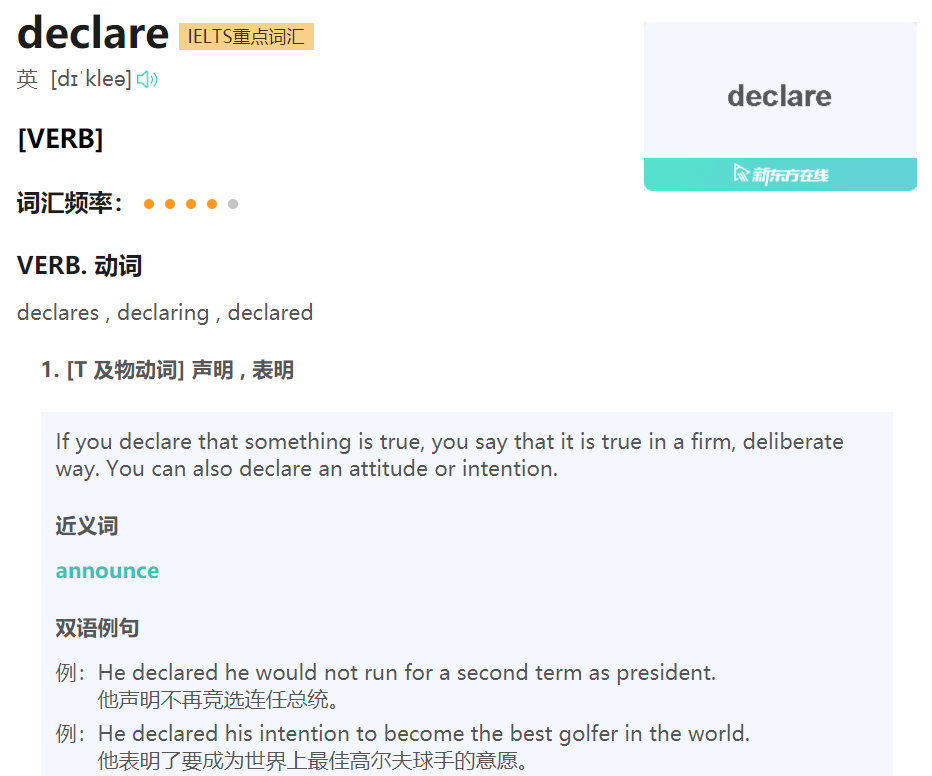 这本词典是新东方和柯林斯合作出版的雅思备考词典,与其它词典相比,该词典的最大特点就是它在保持专业度的同时与雅思考试的贴合度很高: