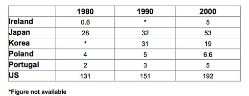 In each of these years, the US produced more waste than Ireland, Japan, Korea, Poland and Portugal combined. It is also noticeable that Korea was the only country that managed to reduce its waste output by the year 2000.
