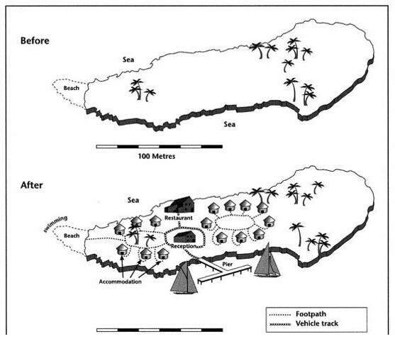 Both maps display an island, before and after it was developed for tourism.