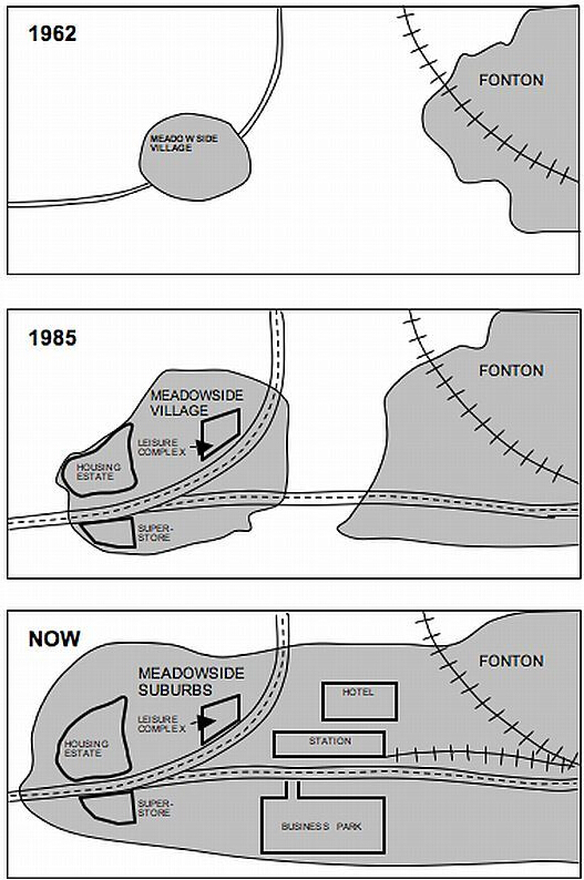 By 1985, there was a considerable growth in the size of Meadowside village and Fonton. The small road in Meadowside village had been converted into a main road and was also extended to the east to connect with Fonton. Meadowside, moreover, had also developed a housing estate in the west, a leisure complex and a supermarket in the south.
