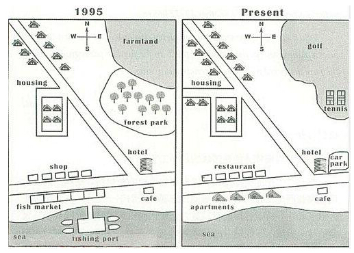 The two maps show the layout of the same seaside village in 1995 and at present.