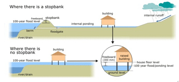 The first diagram shows how a stopbank acts as a flood barrier to stop river water from flooding homes. The stopbank is a small mound of land next to the river that is higher than the 100-year flood level, and prevents the river from bursting its banks. Nearby houses can be built on stilts to prevent flooding from rainwater, and a floodgate beneath the stopbank can be opened to allow this ‘ponding’ to drain off into the river.