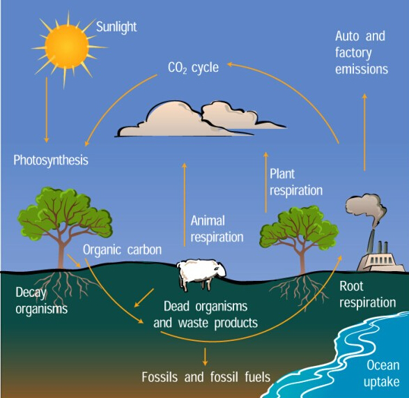 Carbon is also released back into the atmosphere, however, through various means. One is when animals and plants respire, and another is when humans burn fossil fuels in cars and factories. All this carbon enters the atmosphere as CO2. It is then reabsorbed by plants, and the cycle begins again.