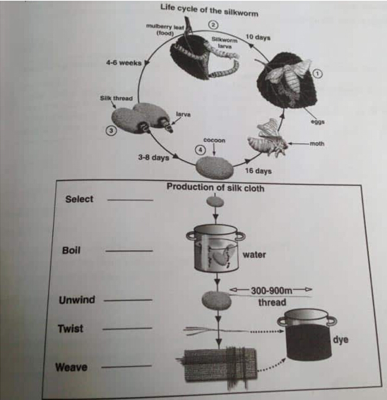 It is a process diagram, featuring the life cycle of the silkworm and the