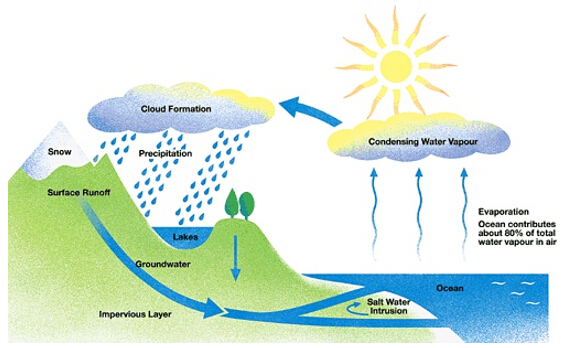 At the third stage in the cycle, rainwater may take various paths. Some of it may fall into lakes or return to the oceans via ‘surface runoff’. Otherwise, rainwater may filter through the ground, reaching the impervious layer of the earth. Salt water intrusion is shown to take place just before groundwater passes into the oceans to complete the cycle.(156 words)