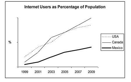 In 1999, the proportion of people using the Internet in the USA was about 20%. The figures for Canada and Mexico were lower, at about 10% and 5% respectively. In 2005, Internet usage in both the USA and Canada rose to around 70% of the population, while the figure for Mexico reached just over 25%.