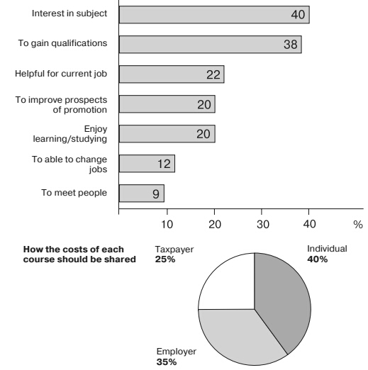 chart shows the reasons why adults decide to study. The pie chart shows how