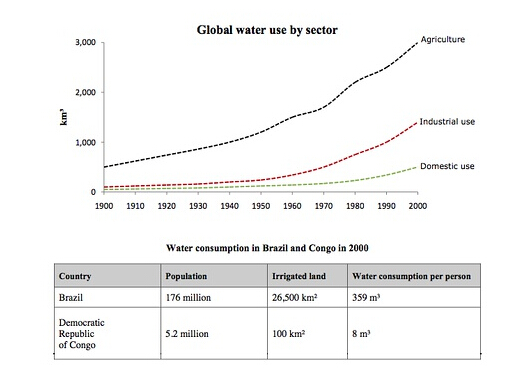 In the year 2000, the populations of Brazil and the Congo were 176 million and 5.2 million respectively. Water consumption per person in Brazil, at 359m³, was much higher than that in the Congo, at only 8m³, and this could be explained by the fact that Brazil had 265 times more irrigated land.(184 words)