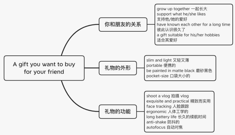 这个题目是偏向于有形物品的一个描述,所以我们可以把物品的外貌和功能等去进行一下描述,包括其颜色,大小,形状等,为什么这个外形适合送给你的这个朋友。功能的话也可以列出多种功能,给出一些例子或者场景去解释为什么你要把这个礼物送给你的朋友。我们在说这个题的时候,还有一个延伸点就是你要送礼物的这个朋友,是什么性格,爱好,你和他/她的关系等。