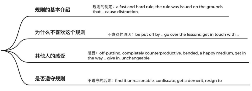 这道题的思路有很多,首先要确定规则的具体内容。如果你是学生,那就可以说 一些和自己的日常生活,包括衣食住行,以及兴趣爱好相关的规则,比如不允许 在校外吃饭,必须要穿校服,不能染发,不能在校外租房子住等(衣食住行), 或者不允许在校内使用电子设备(兴趣爱好);如果你在职,那也可以根据以上 的思路来确定要说的内容,比如必须统一制服等;话题可以从规则是何时制定的, 具体是谁制定的以及制定的原因等细节来展开,之后需要解释为什么自己不喜欢 这个规则以及其他人对这个规则的感受。在这道题中我描述了不允许在校外就餐, 大家可以通过文本来梳理思路,给出符合自己实际情况的描述。