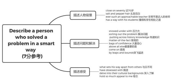 通过对题卡进行审题,确定题目考查描述对象是人物,限定成分是使用聪明的方式解决问题, 所需时态为一般现在时,现在完成时,一般过去式,过去完成时,过去进行时等。关于人物题我们可以从三个部分展开描述,即(1)背景介绍 (2)扣题描述 (3)原因/感受。首先关于(1)背景介绍, 可以从该人物性格和职业两个角度进行展开。其次(2)扣题描述,可以从问题内容和解决方式展开,首先对问题进行描述,阐述问题起因。其次提供解决方案,描述解决方案内容,其次强调解决方案聪明特征,最后问题被解决之后结果。最后从(3)原因/感受两个方面来去描述聪明解决方式的原因。其中关于原因的描述我们也可以利用 Cheers 原则进行展开,比如社交 Communication, 健康 Health, 金钱 Economy/money, 教育 Education, 娱 乐 Recreation/entertainment, 放 松 Stress/relaxation 。