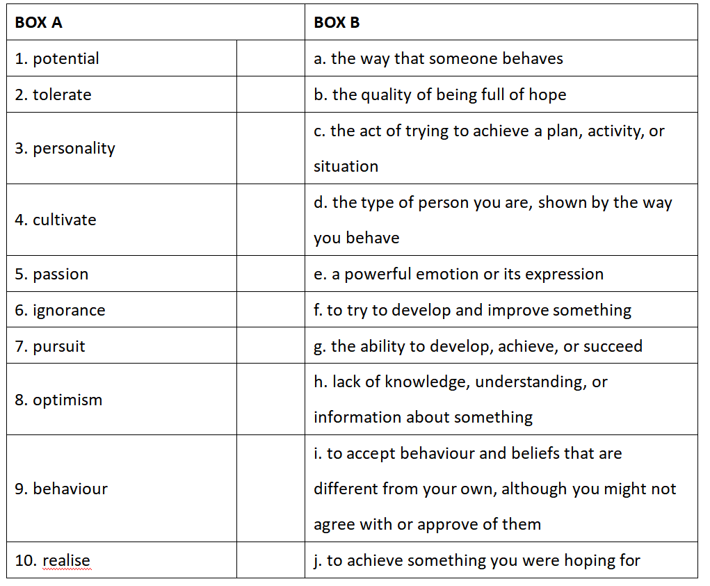 1. Match the words and expressions1-10in box A with a suitable definition a-j in box B.