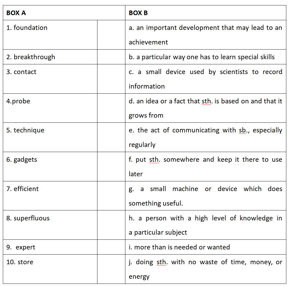 1. Match the words and expressions 1-10 in box A with a suitable definition a-j in box B. 匹配A框中的词汇表达1-10与B框内的解释 a-j.