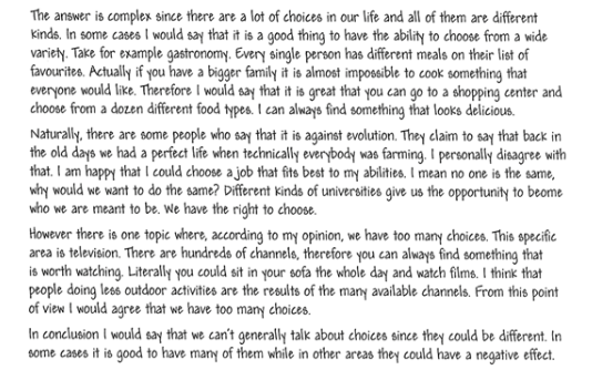 然而,有一个话题根据我的个人看法确实给我们的选择太多了。这个领域就是电视频道。有上百个电视频道,我们完全可以坐在沙发上看一整天的电影。我认为这也是为什么现在人越来越少的去做户外活动,因为节目太丰富。从这个角度来说,我觉得我们被给予的选择太多了。
