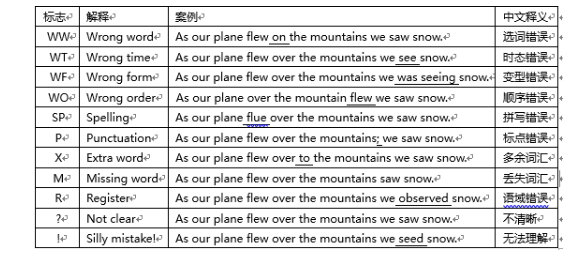 很多学生会说,所谓的没有错误具体指的是哪些?请大家看一下英国作文修改的标记就知道了(Correction Codes)