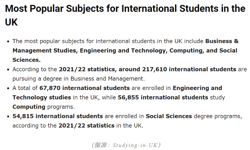 根据2021/22年度的统计数据,约有217610名国际学生正在攻读商业与管理学位,共有67870名国际学生在英国学习工程和技术,56855名国际学生学习计算机项目;