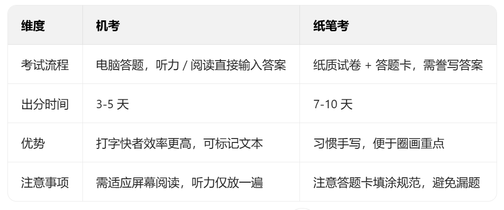 建议:习惯电子设备、需快速出分(如赶申请截止日期)选机考;偏好纸质记录、担心打字失误选纸笔考。
