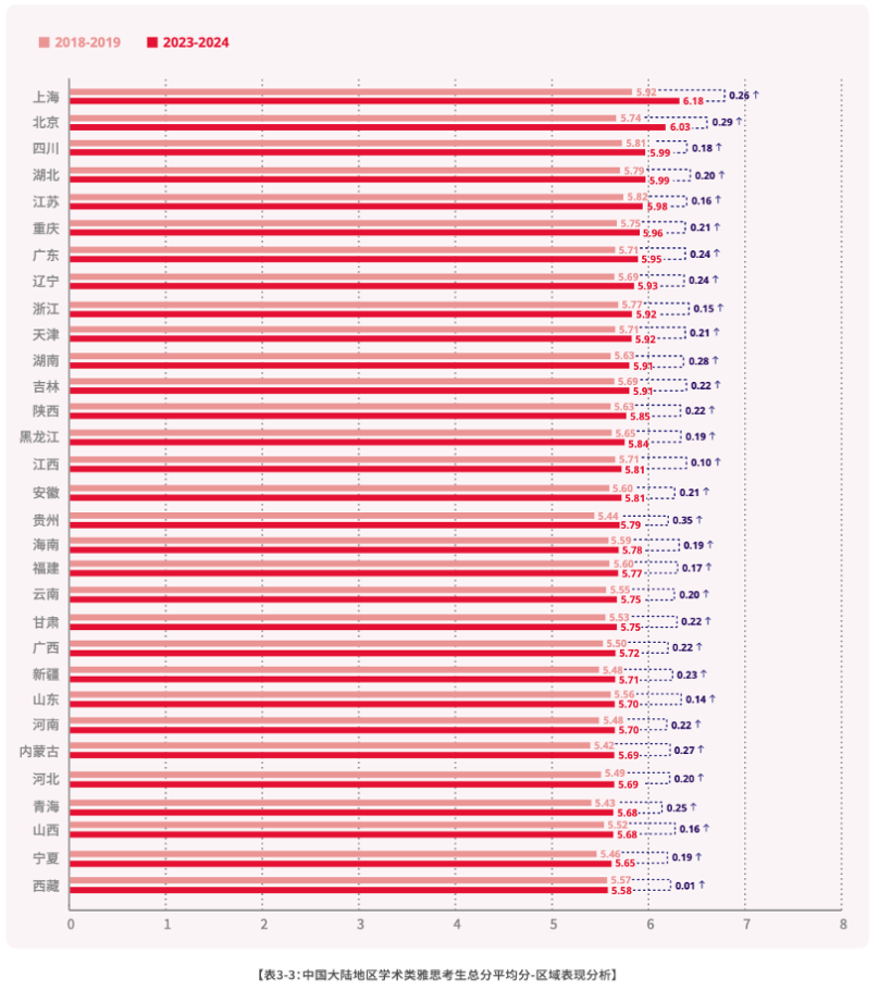 此外,2023-2024年中国大陆地区各省份/直辖市学术类雅思考生总分均有进步,不过也呈现出一定的地域差异。