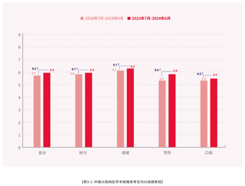 根据BC发布的《2023-2024中国大陆地区雅思成绩大数据报告》,中国大陆雅思考生A类(学术类)的总分均分为5.9分。