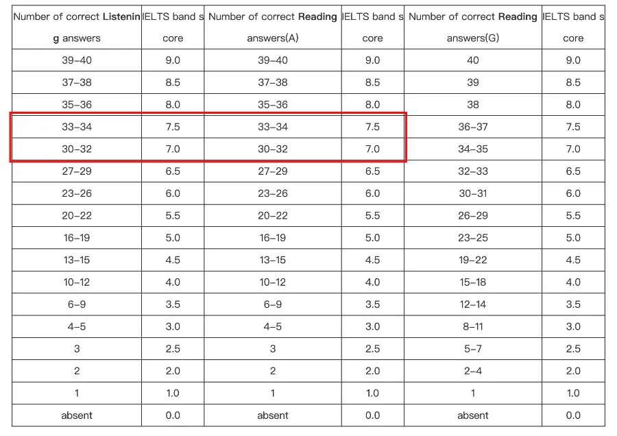 听力和阅读都是以正确题目的数量来进行评分的,根据最新的评分标准,需要正确完成30道题才能达到7分,正确完成33道题即可达到7.5分。所以想要拿到7分,甚至7.5分,也是有6-10道题的容错率的。