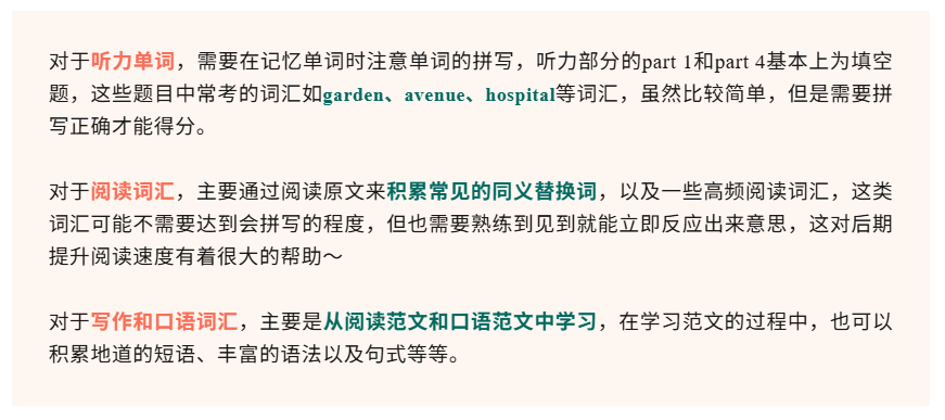 对于基础不太好的小伙伴来讲,备考的第一个月需要将重点放在单词基础上。最好能保证每天有1个小时来记忆单词,每次记忆80-100词左右,并且积累单词是需要贯穿整个雅思备考过程的。在记忆单词的时候,最好可以按照听说读写分类来记忆: